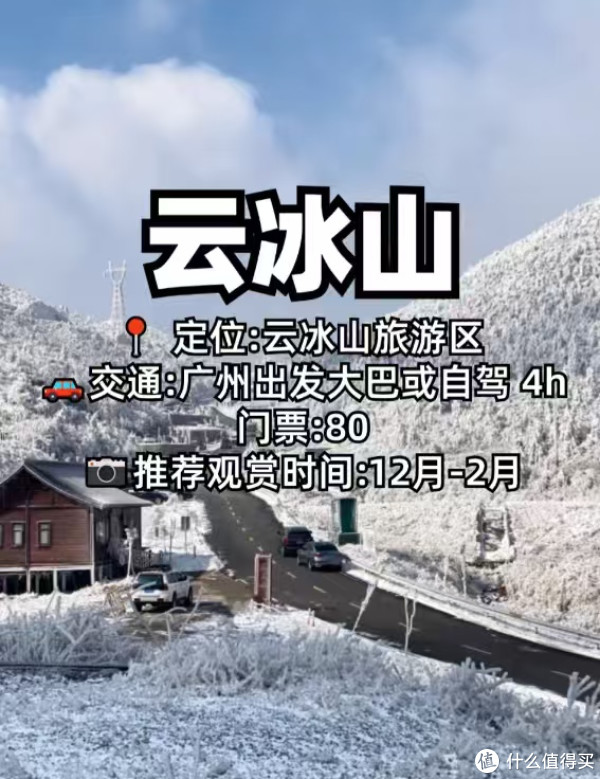 不用远赴北方,广 东及周边就有多处绝美赏雪地,让你轻松拥抱冬日浪漫! 云冰山旅游区 定位:云冰山旅游区 交通:广州出发4小时车程 门票:80元 最佳观赏期:12月至2月 云冰山,一个让广东人离雪景最近的地方。这里的冰雪景观如梦如幻,仿佛踏入了一 个童话世界。