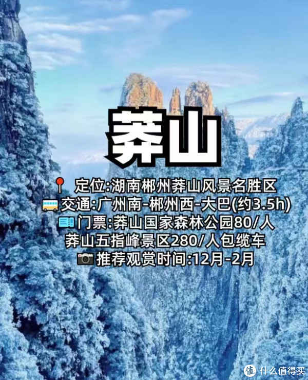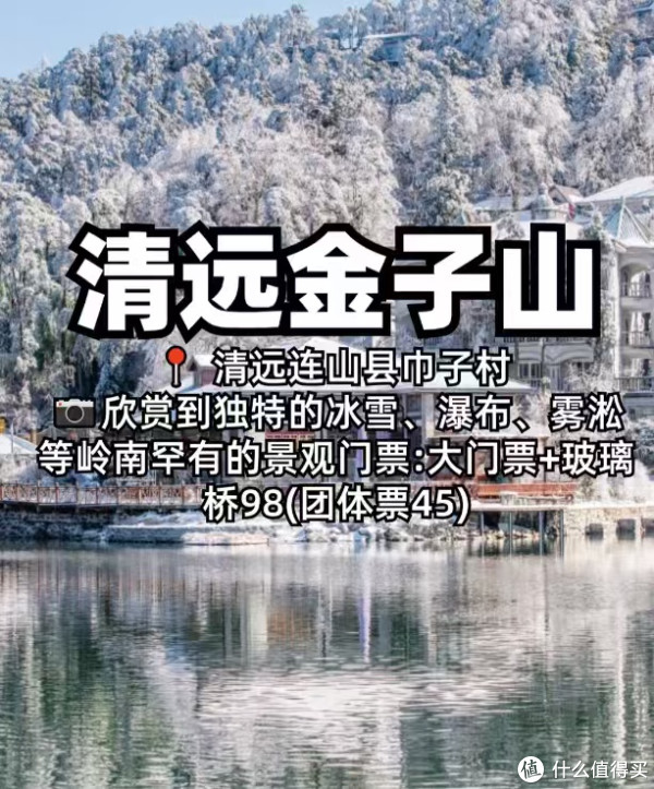 莽山风景名胜区 定位:湖南郴州莽山 交通:广州南-郴州西,再转大巴约3.5小时 门票:国家森林公园80元/人,五指峰景区280元/人(含缆车) 最佳观赏期:12月至2月 莽山的雪景壮丽而神秘,尤其是五指峰景区,缆车穿梭于冰雪之间,带你领略不一样 的冬日风情。 清远金子山 定位:清远连山县巾子村 距离:广州出发约260公里 门票:大门票+玻璃桥98元(团体票45元) 金子山的冰雪、瀑布、雾凇,是岭南罕见的奇观,让你在南方也能感受到北国的风 光。