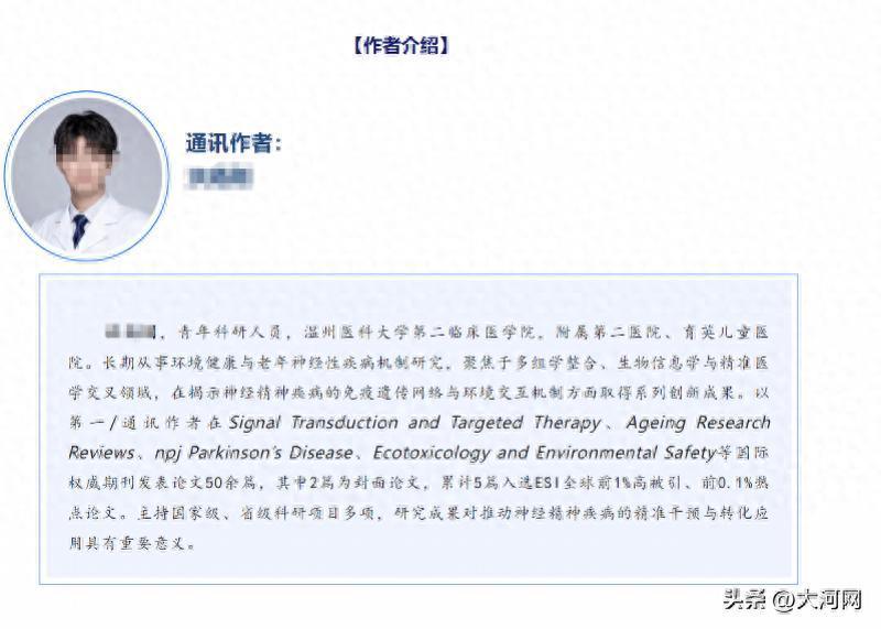 根据洪某某发表过论文的国际期刊Environmental Chemistry and Ecotoxicology微信宣传公众号“环境化学与生态毒理ENCECO”发布的内容,洪某某自我介绍:来自温州医科大学第二临床医学院,附属第二医院、育英儿童医院,系青年科研人员,以第一/通讯作者身份在多个国际权威期刊发表论文50余篇,其中2篇为封面论文,累计5篇入选ESI全球前1%高被引、前0.1%热点论文。洪某某还自称,主持国家级、省级科研项目多项,研究成果对推动神经精神疾病的精准干预与转化应用具有重要意义。