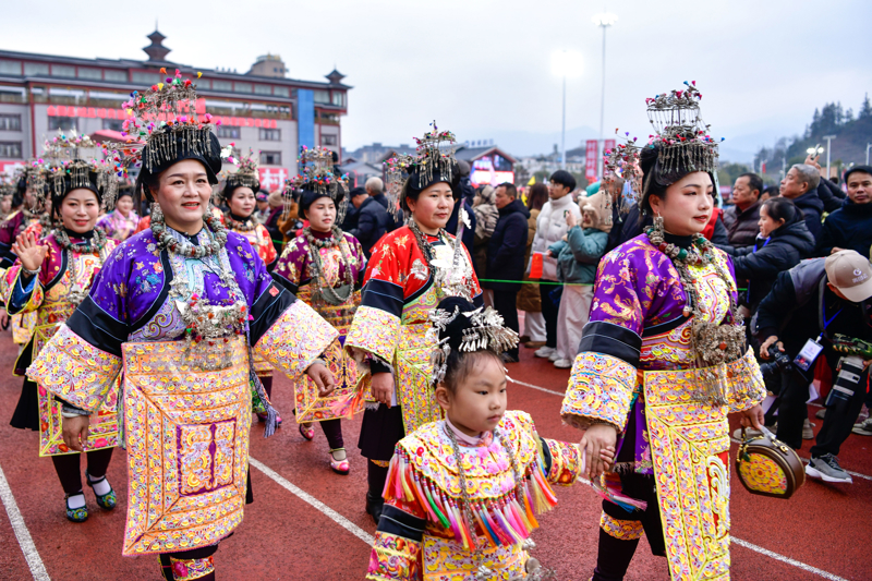 1月2日,侗族群众参加第四届贵州“村超”开幕式巡游。当日,第四届贵州“村超”开幕式暨“村超村晚”活动在榕江县举行。“村超”参赛队从2023年第一届的20支增至本届的137支,“百村大战”规模升级。新华社记者 杨文斌 摄